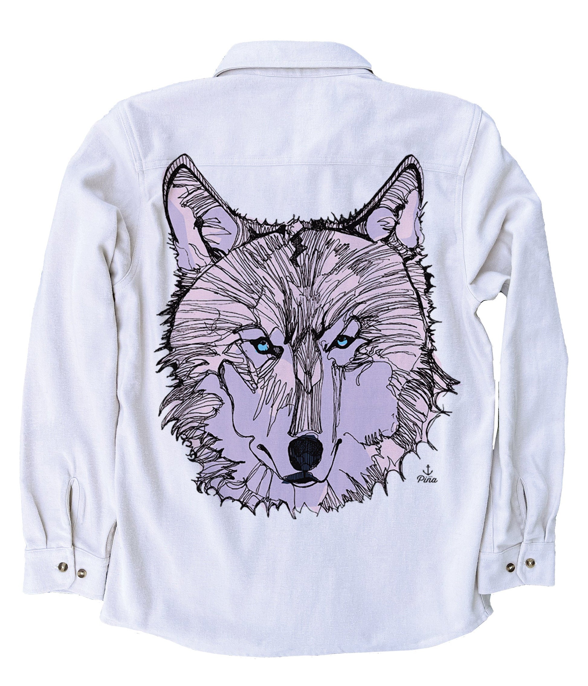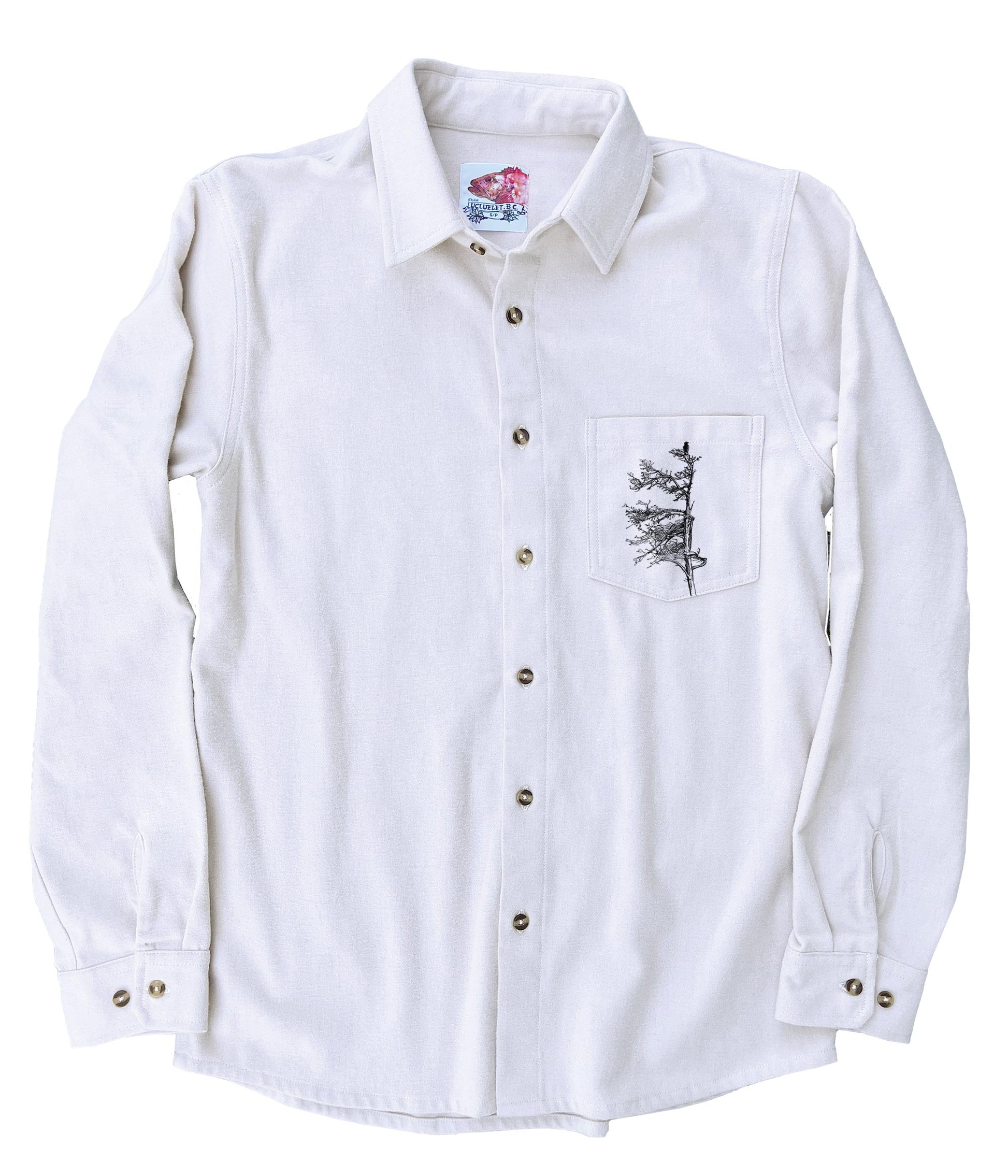 This soft and comfortable organic cotton flannel is printed with our detailed Wolf Face design–coloured in a pretty ink–on the back, and a small spruce tree on the front pocket.