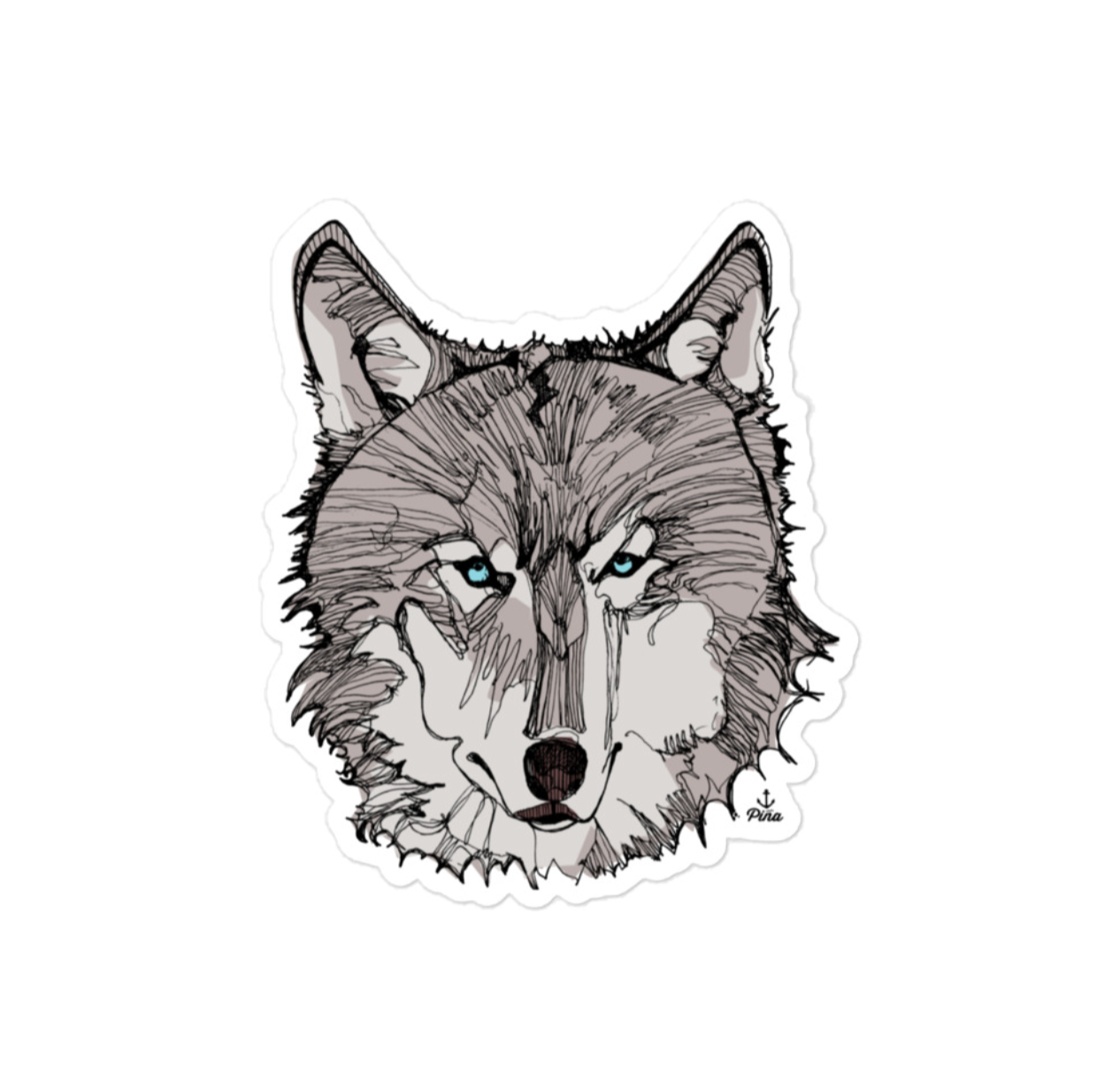 A high opacity adhesive vinyl sticker of our detailed Wolf Face design. This lone wolf is drawn in ink and coloured with beautiful beiges and bright blue eyes.